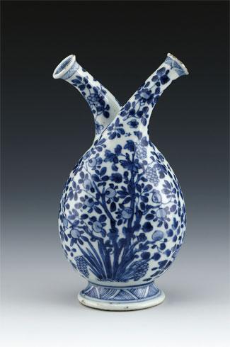 在這次展覽中,還有一個造型很顯眼的雙管瓶,或者也叫它油醋瓶,它有兩個口,中間是不通的,可以裝兩種液體調(diào)味品,這就是典型的定燒器。我們看到展品中的香薰形狀很高挑,跟我們的傳統(tǒng)式樣也不一樣。展出的景德鎮(zhèn)窯青花如意花卉紋香薰,是康熙貿(mào)易瓷中不多見的精品。
