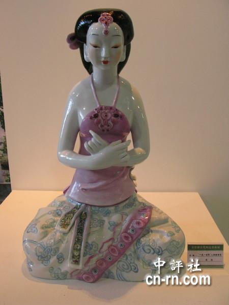 江西景德鎮(zhèn)陶藝家周玲雕塑瓷作品"一花一世界",仕女豐姿綽約。